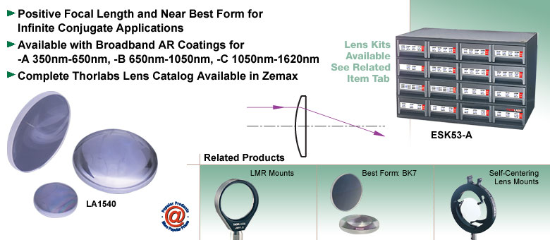 Thorlabs BK7平凸透镜广泛应用于多种场合。平凸透镜具有正焦距,且在无穷远和有限共轭应用中均接近最佳形状。有关最佳形状透镜的详细信息,请参阅上文链接。这些透镜可将光线准直光束至后焦,并对点光源发出的光线进行准直。它们的设计具有最小的球面像差,其焦距f等于R/(n-1),其中n为折射率,R为透镜表面的曲率半径。
