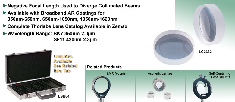 Thorlabs BK7和SF11平凹透镜广泛应用于多种场合。平凹透镜可将准直光束发散至一个虚焦点,这正是伽利略式扩束器所采用的原理(参见“绘图”选项卡以获取参考信息)。平凹透镜具有负焦距和负球差。负球差可用于平衡系统中其他镜片的像差。