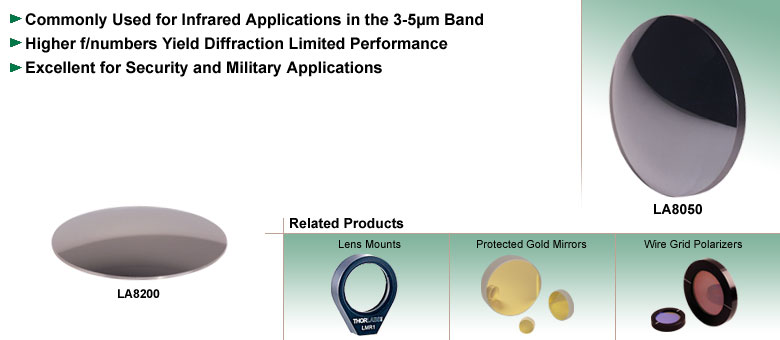 Thorlabs硅制平凸透镜在许多红外应用中广受欢迎。它们通常用于光谱中3至5微米波段的成像应用,因此非常适合安防和军事领域。它们还可用于准直红外激光。这些透镜镀有BBAR涂层,在3-5微米光谱范围内可实现98%的透射率。