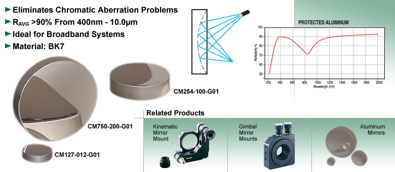 Thorlabs的镀铝凹面镜是光学系统的绝佳选择,尤其适用于色差和抗反射涂层不足可能在宽波长范围内成为显著问题的场合。由于某些玻璃材料存在色差和透射限制,这些凹面镜可完美替代传统的透镜-反射镜组合。它们的焦距由公式f = -R/2描述,其中R为镜面的曲率半径。当在有限共轭条件下使用时,需确保入射光束的视场角较小,以避免球面像差和彗差。
