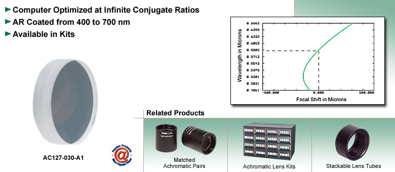 Thorlabs的胶合消色差双合透镜经过计算机优化,可在可见光区域提供卓越性能。我们设计的消色差双合透镜采用了氦的“d”线(587.6纳米,黄色)以及氢的“F”线(486.1纳米,蓝绿色)和“C”线(656.3纳米,红色)。这些波长合理地代表了可见光谱,并被用于定义材料的阿贝数,即V。消色差双透镜有助于控制色差, 并常用于在使用激光等单色光源时实现衍射极限的光斑。请参阅上方的应用选项卡,了解消色差双合透镜相较于单片透镜的卓越性能。有关每种消色差双合透镜的详细信息,请查看随支持文档提供的Zemax文件,这些文件位于每个双合透镜的MFG规格链接下。