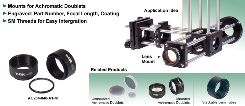 Thorlabs提供这些安装座,适用于我们的胶合双合透镜,便于操作并可轻松安装至Thorlabs的机械结构中。每个安装座上均刻有透镜零件编号、镀膜信息及焦距。