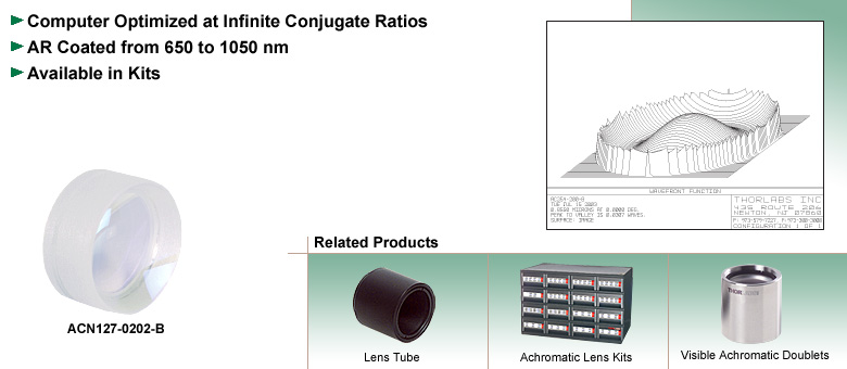 Thorlabs的胶合消色差双合透镜在无穷远共轭比下经过计算机优化。这些消色差双合透镜专为近红外波段设计,其设计波长分别为706.5 nm、855.0 nm和1015 nm。消色差双合透镜有助于控制色差,并常用于在使用激光等单色光源时实现衍射极限光斑。有关每种消色差双合透镜的详细信息,请查看各双合透镜MFG规格链接下支持文档中包含的Zemax文件。