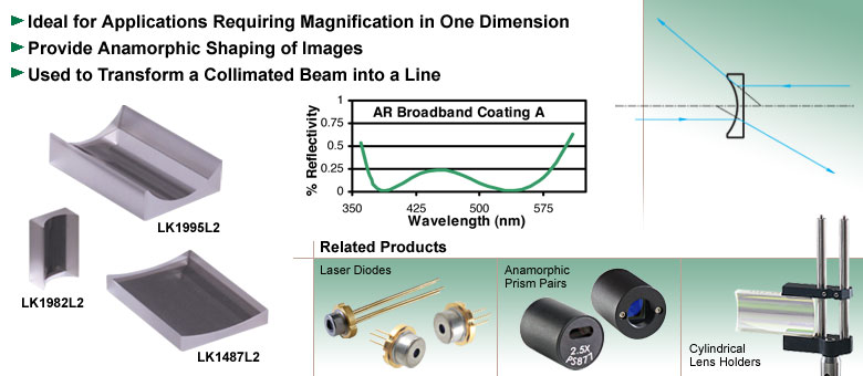 负柱面透镜的作用类似于平凹球面透镜,只是仅在一个轴向上有所不同。这类透镜用于需要对光源进行一维整形的应用场景。典型应用是利用单个柱面透镜将准直激光转变为线光源。