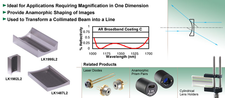 负柱面透镜的作用类似于平凹球面透镜,只是仅在一个轴向上有所不同。这类透镜用于需要对光源进行一维整形的应用场景。典型应用是利用单个柱面透镜将准直激光转变为线光源。可使用一对圆柱透镜对图像进行变形处理。