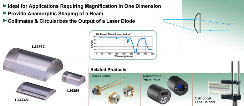 正圆柱透镜非常适合需要在一维上实现放大的应用。球面透镜对入射光线在两个维度上均呈对称作用,而圆柱透镜则以相同的方式仅在一维上发挥作用。典型的应用是使用一对圆柱透镜来对光束进行非等比例整形。一对正柱面透镜可用于准直并使激光二极管的输出光束呈圆形。另一种应用可能性是使用单个透镜将发散光束聚焦到探测器阵列上。