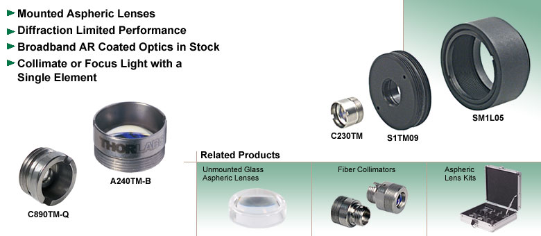 Thorlabs将模压玻璃非球面透镜安装到不锈钢透镜座中,透镜座上刻有零件编号,便于识别。这些已安装的非球面透镜采用标准公制螺纹,可轻松集成到您的装置或OEM应用中。通过使用我们的非球面透镜适配器。