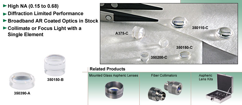 在与光纤耦合时,通常需要将激光光束聚焦至衍射极限的光斑。单个球面元件通常无法实现如此小的光斑尺寸。限制因素主要是球差,而非衍射极限。由于非球面镜片经过校正以消除球面像差,因此只有衍射限制了焦点斑的大小。