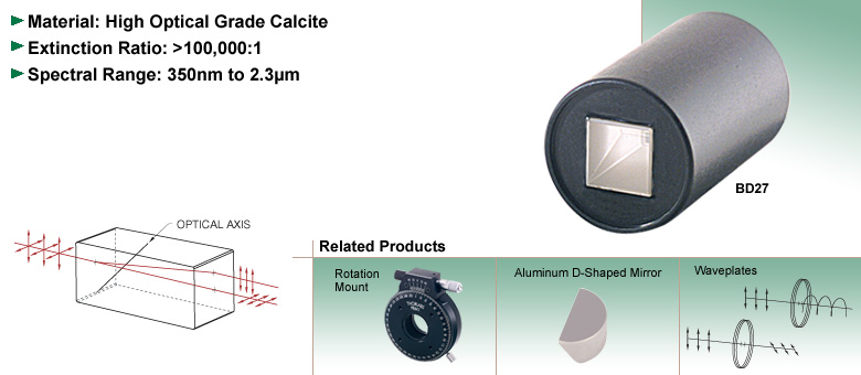 偏移棱镜用于将输入光束分离成两束正交偏振的输出光束,也可用作偏振分束器,适用于无法实现光束90°分离的应用场景。凭借最高品质的光学级方解石 材料,我们的偏移棱镜可适用于350纳米至2.3微米的波长范围。由于方解石是一种质地柔软的晶体,容易受损,我们的方解石偏振片采用1英寸金属外壳封装,可安装于我们的光机电支架中。 我们的安装式光束位移器提供两种型号,位移量分别为2.7毫米和4.0毫米。在这两种型号中,两个输出光束与输入光束的平行度均达到30角秒以内。