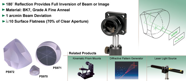 Thorlabs的逆反射器是一种由整块BK7玻璃制成的三面棱镜。通过三次全内反射(TIR),输入光束或图像将被完全倒置并沿原方向反射回去。这种反射与入射光束或图像平行,使该逆向反射器在涉及光束对准和光束传输的应用中非常有用。该棱镜物理方向的不敏感性确保了即使光束或入射光以非正常角度进入棱镜,仍能实现180度的反转反射。