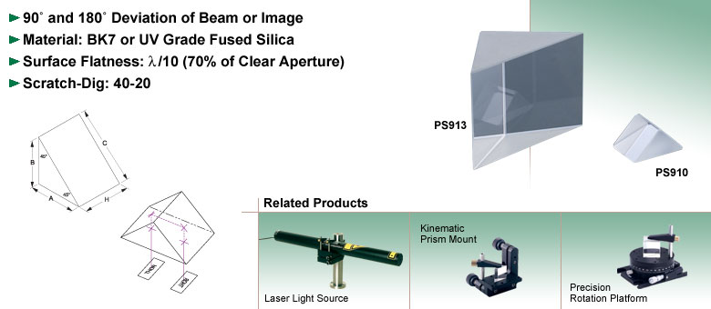 Thorlabs的高精度直角棱镜有BK7或紫外熔融石英两种材质可选,尺寸范围从3毫米到60毫米。根据哪一表面用作光源的入射面,它们可用于将光路偏转90°或180°。