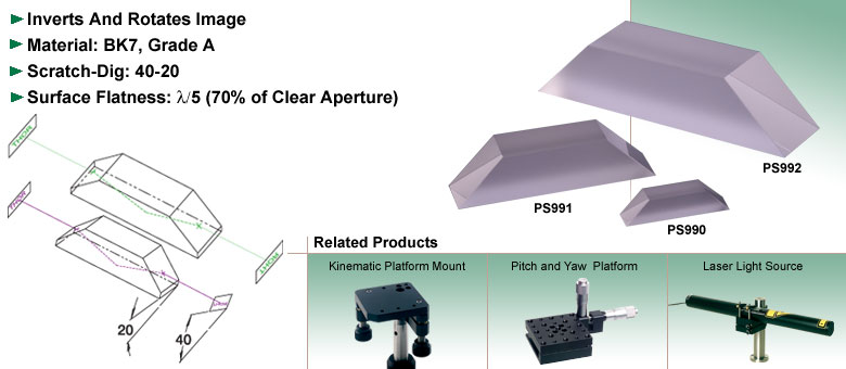 鸽子棱镜是直角棱镜,去除了三角形顶点,从而减轻了棱镜的重量并减少了内部杂散反射。此外,鸽子棱镜的平坦顶面便于将其安装在平台上,并用安装臂固定,就像PM1 或 PM2, 更加简便。