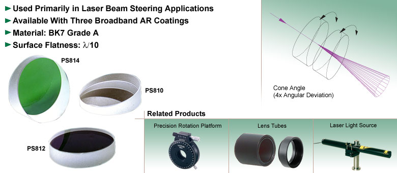 Thorlabs的楔形棱镜非常适合用于激光束转向应用。我们的楔形棱镜可将光束偏转至与棱镜垂直表面成2至10度的角偏差。