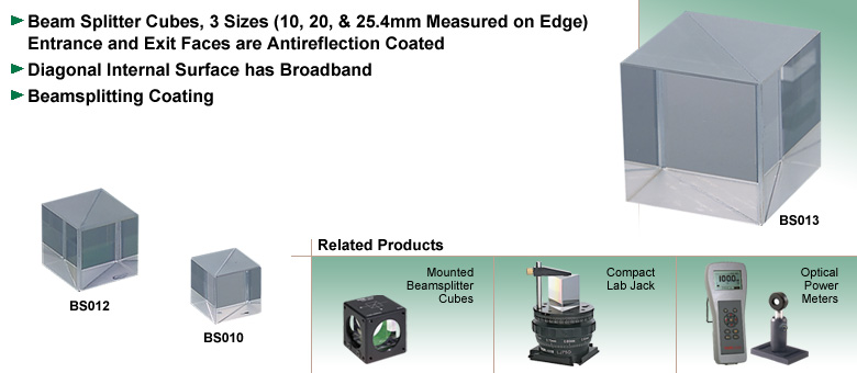 Thorlabs的BS系列非偏振分束立方体提供3种尺寸(10 x 10 x 10毫米、20 x 20 x 20毫米和25.4 x 25.4 x 25.4毫米),每种尺寸均配有针对400至700纳米、700至1100纳米或1100至1600纳米光谱范围设计的镀膜。这些立方体提供的50/50分束比几乎与入射光的偏振无关;确实存在的微小偏振依赖效应可在“图表”选项卡下方显示的透射曲线中看到。不过,在所有波长范围内,s偏振和p偏振分量的匹配度均在彼此的10%以内。每个立方体均由BK7材料制成,其设计使得透射光束的传播方向与入射光的传播方向几乎完全一致。此外,该立方体的入射面和出射面均涂有增透膜,以最大程度地减少背面反射;内部对角面则涂有宽带分束膜(参见右侧示意图)。由于只有一个反射面,这种设计从本质上避免了鬼影。