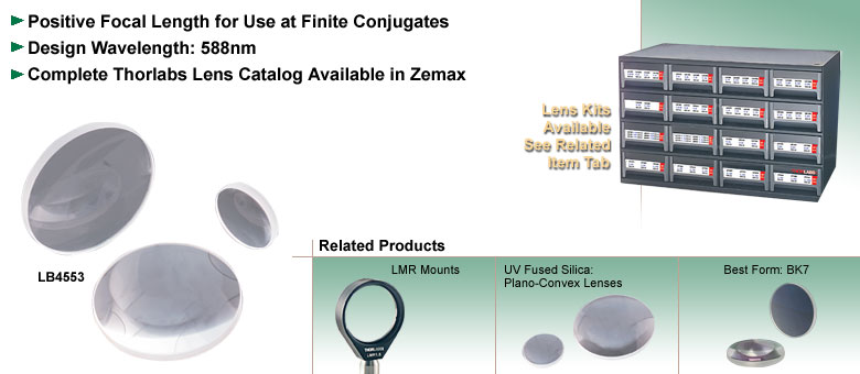 Thorlabs紫外级熔融石英双凸透镜广泛应用于多种有限成像场合。这两面均为球面,且具有相同的曲率半径,可在物体与像到透镜的距离相等或接近相等的情况下,最大程度地降低球差。当物距与像距相等时,不仅球差得到最小化,彗差和畸变也会完全相互抵消。作为参考,双凸透镜在共轭比介于5:1至1:5的范围内能实现最低的像差。平凸透镜通常更合适。