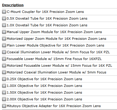 一套完整的光学系统需配备以下组件:C型接口耦合器、燕尾管、上部变焦模块、下部模块以及物镜(可选配三丰适配器)。电动上部变焦模块内置控制器及所需电缆。手动上部变焦模块与电动上部变焦模块均配备手动光圈。40英寸柔性光纤束专为配合同轴照明下部模块而设计。光纤适配器可使该光纤束与我们的光纤照明器(不含Mille Luce)。可选环形灯适配器(型号#56-215)可用于将环形导光管(型号#54-173)安装到镜头上。