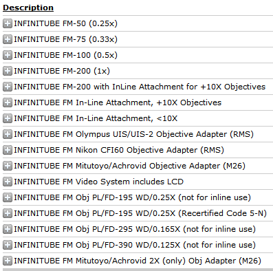 这种直列式组装系统用于将无穷共轭物镜安装到C型接口相机上,可实现普通视频镜头无法达到的放大倍率,例如50倍放大。InfiniTube®系统可采用多种配置方式。在照明由其他光源(如背光或定向照明)提供的情况下,该系统可单独使用(InfiniTube™ #58-310或#58-309)。此外,InfiniTube™还可通过附加组件实现直列式照明。首个直列式附件(#58-313)专为搭配10倍或以下放大倍率的物镜而设计,不建议用于更高放大倍率的物镜。第二个直列式附件(#58-312)则旨在与10倍或更高放大倍率的物镜配合使用时提高效率,但也可适用于所有放大倍率。所有直列式附件均兼容我们的光纤导光器,尖端直径为0.312英寸。另提供InfiniTube™直通式组件(型号#58-311)。物镜适配器需另购。可在直通式连接件中安装9毫米滤光片。C型夹具,带1/4-20安装孔(型号#57-788)单独出售。