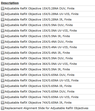 我们推出的TECHSPEC®可调ReflX™物镜系列,原名Beck/Ealing反射式物镜,采用坚固耐用的设计,并提供种类繁多的放大倍率,以满足各种不同的应用需求。所有产品在组装时均配置为160毫米筒长和0.17毫米盖玻片,并经过精密校准,以实现最佳性能。不过,为无限延长物镜的使用寿命,除15X、0.5NA型号外,其他型号均配备有专用内镜片中心调节功能,可使用随附的内六角扳手进行调节。对于更高倍率(36X、52X和74X),可通过移动套环对镜筒长度及盖玻片校正进行调整。(若镜筒长度发生改变,应检查并重新调整镜片中心。)