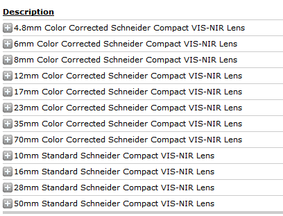 施耐德的彩色校正VIS-NIR镜头专为容纳高达2/3英寸的传感器而设计,因此在400-700nm(VIS)与700-1000nm(NIR)之间切换时无需重新对焦。这些镜头可在整个光谱灵敏度范围内使用,且无需调整焦点。