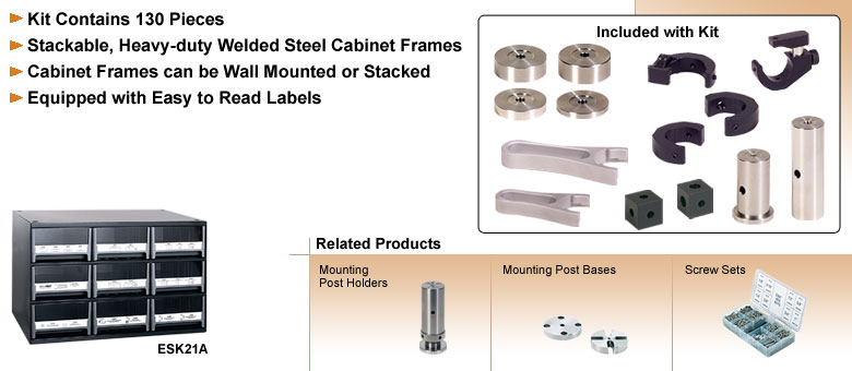 ESK21A立柱式支架系统基础套件提供构建超高稳定性光学平台所需的组件。该套件包括直径1英寸的立柱、底座、结构立方体和立柱夹具。本系列新增了基座式立柱系列及配套的夹紧叉。这些新型支撑柱实现了以往支柱系统所不具备的便捷定位功能。RB2底座设计使延伸柱可用作可变高度的安装解决方案。