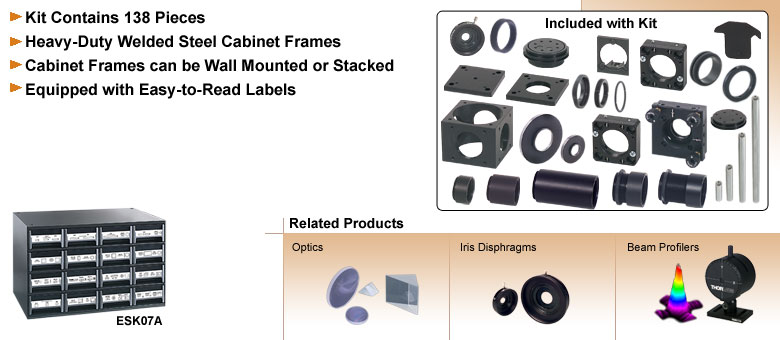 ESK07A笼式组件与透镜筒必备套件包含我们138种最受欢迎的笼式组件部件,全部整齐地收纳于一个贴有完整标签的柜子中。每个抽屉都清晰地标有产品图标,以便快速找到所需零件。套件内容见下图。该笼式系统采用我们的SM1系列透镜筒及配件。