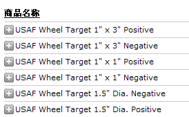 USAF环形图案可同时测试视场中多个点的分辨率,此图案可选三种不同规格的尺寸,1平方英寸,1.5英寸直径,或1英寸X3英寸的测试片,每种规格的测 试片都有8个USAF图案以中心为圆心环形分布另加中心1个图案,各种尺寸都有正片(图案不透明背景透明),和负片(图案透明背景不透明)。