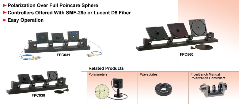 光纤中产生的双折射量取决于光纤包层直径、线盘直径(固定)、每线盘的光纤圈数以及光波长。光纤的快轴位于线盘平面内,可通过手动旋转桨叶来调整其与透射偏振矢量之间的相对角度。货号FPC031、FPC032、FPC561和FPC562是光纤偏振控制器,已预先加载光纤。