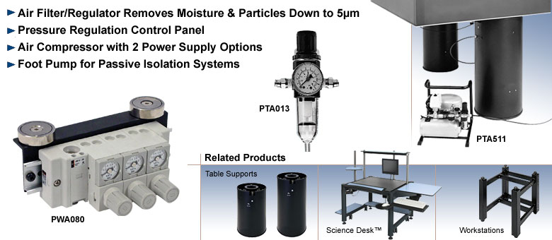 压力调节控制面板(PWA080和PSX080)压力调节控制面板是无源隔振系统的绝佳升级方案。三个独立的压力调节阀可轻松实现台面的水平调整,并有效补偿台面受力不均的问题。