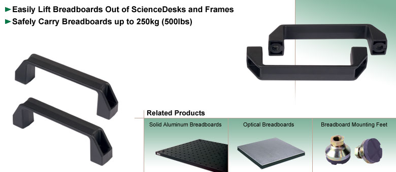 BBH1和BBH1/M面包板手柄便于搬运和运输Thorlabs生产的面包板。这种玻璃纤维增强聚合物手柄经安全认证,正确安装后可承载250千克(550磅)。每个手柄均设有两个安装孔,其中BBH1的安装孔间距为6英寸,BBH1/M的安装孔间距为150毫米,可用于通过随附的螺钉和垫圈将手柄固定到面包板上。对于较大的面包板,建议使用四个把手,每个角一个。