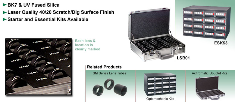 Thorlabs已将直径0.5,1,2英寸的薄透镜装入此工具箱. 透镜包含双凸,平凸,双凹,平凹,和新月镜, LS 系列中透镜装在黑色氧化卡圈中,可与本公司SM05, SM1 或 SM2 安装系统兼容。 ESK系列中包含的是裸镜片。