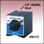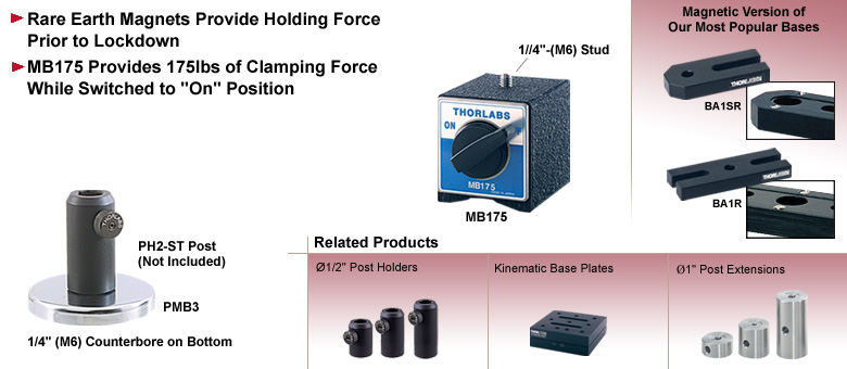可切换磁性底座MB175重型磁性底座配备可切换磁铁,便于快速定位光学元件。其两个底部安装面经过精密研磨,适用于光学平台应用。