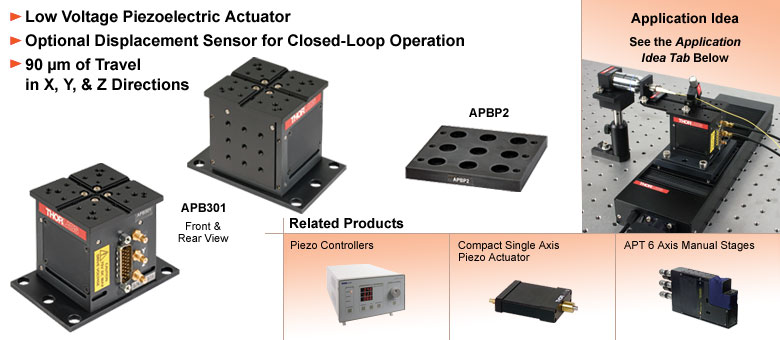 压电块TM创新PiezoBlock™ 平台配备了与我们的MicroBlock™和NanoMaxTM平台相同的带槽顶板,便于快速进行系统重新配置。此外,还附带一块底板,可将其固定到工作表面上。通过随附底板和顶板一起发货的APB301和APB302,整套组件的标准台面高度为62.5毫米,从而与我们其他平台产品相匹配。APBP2适配板可将任意一款PiezoBlock™ 3轴位移器安装到我们的LNR或NRT长行程平台上(请参阅页面顶部的应用示意图)。它随附六个1/4-20(M6)带帽螺钉、六个1/4-20(M6)尼龙垫圈以及一把3/16(6毫米)内六角扳手。除了这款适配器外,Thorlabs还提供种类丰富的配件用于PiezoBlock™,使其成为众多研发和工业应用的理想工具。