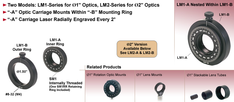 Ø1" (25mm) 光学安装套件LM1-A座架可直接将直径为1英寸(25毫米)的光学元件安装至其SM1(1.035英寸-40)螺纹孔中,最大厚度可达0.38英寸(9.6毫米)。配套的LM1-B座架通过位于顶部的拇指螺丝实现位置锁定,并可通过底部的#8-32(M4)螺纹孔进行安装。每件包含一个SM1RR固定环,用于将光学元件固定在SM1(1.035英寸-40)孔内。