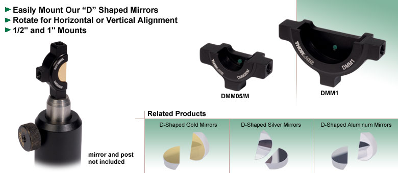新款支架专为安装我们新款镀金、镀银及镀铝的D形镜面而设计。这些支架可轻松地朝上或朝下调整方向。它们提供½英寸和1英寸两种尺寸,并可通过#8-32或M4安装螺纹固定到我们种类繁多的立柱上。