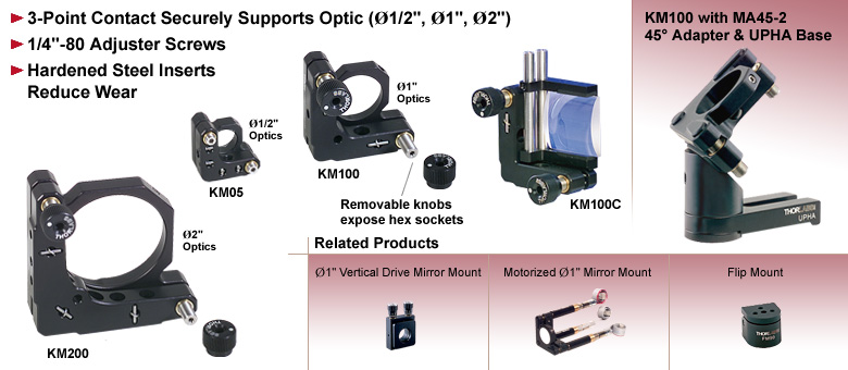 Thorlabs提供多种双调节运动学反射镜安装座:包括我们的Ø0.5英寸反射镜安装座KM05、我们最受欢迎的Ø1英寸反射镜安装座KM100、我们最受欢迎的Ø2英寸反射镜安装座KM200,以及我们的……KM100C,可兼容高达65毫米高的圆柱形光学元件。