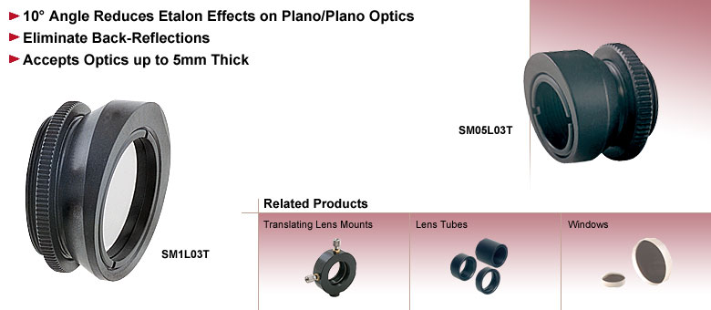这些SM05L03T和SM1L03T角形光学安装座专为在光学装置中安装½英寸或1英寸光学窗口而设计。安装座以10°角度设计,可最大限度地减少背面反射,其背面配有SM螺纹,便于与½英寸或1英寸镜筒轻松对接。借助我们的镜头筒转换器,这两种安装座也可用于2英寸和3英寸镜头筒的配置。两种安装座均能兼容厚度达5毫米的光学元件,可用于我们所有的窄带激光窗口或多种宽带窗口。