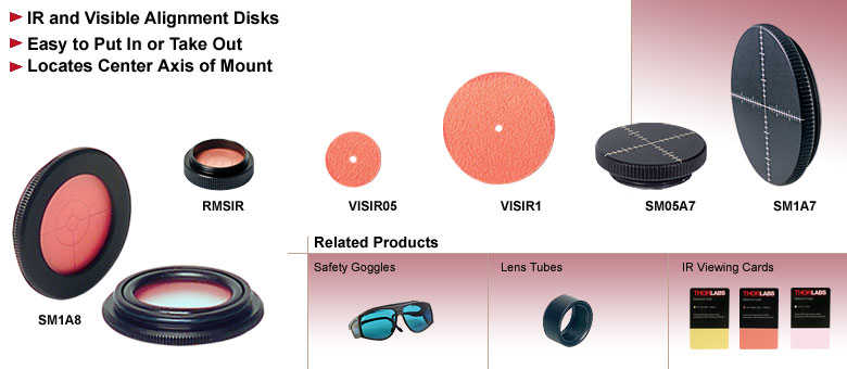 Thorlabs提供六种带有感光检测区域的对准盘。VDIR05和VDIR1采用了一种增强型感光材料,其吸收波段分别为790至840纳米、870至1070纳米以及1500至1590纳米;而VISIR05、VISIR1、SM1A8和RMSIR则采用了一种感光材料,其吸收波段为400至600纳米以及800至1700纳米。