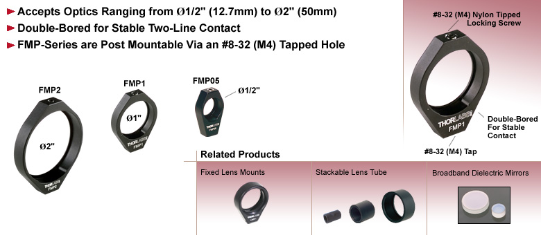 这些固定式镜架提供了一种经济实惠的方式,用于在光机电组件中固定镜子或通用光学元件,而无需进行运动学调整。光学安装区域采用双孔设计,可实现两道稳定接触,由带尼龙头的锁定螺钉施加精确相反的夹紧力。光学元件的后部靠在一个小凸肩上,该凸肩提供了一个几乎与光学元件本身一样大的清晰孔径。所有型号均在底部设有#8-32(M4)螺纹孔,可直接与我们的安装柱兼容。