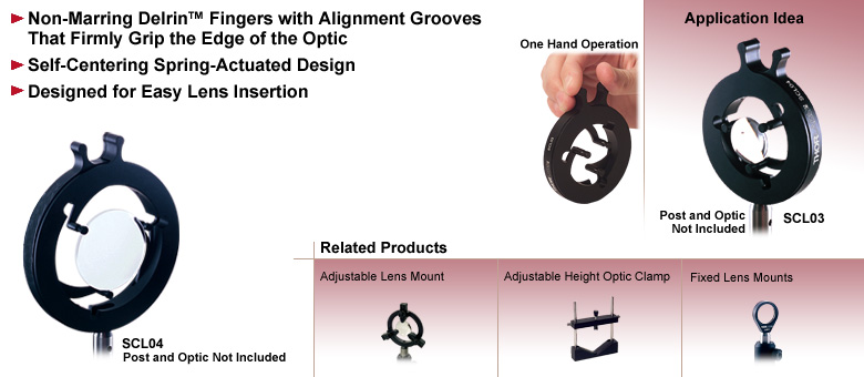 SCL03的三个弹簧手指可自动夹持直径从Ø0.15英寸(3.8毫米)到Ø1.7英寸(43毫米)的光学元件,而SCL04则可夹持直径从Ø0.15英寸(3.8毫米)到Ø3.00英寸(75毫米)的光学元件。只需用拇指和食指轻捏执行器卡舌,即可单手轻松打开镜片固定夹持器的夹指。当松开执行器卡舌时,镜片便自然地被夹持在安装夹指之间。弹簧夹指能够牢固地夹紧光学元件,同时嵌套环设计的凸轮机构可精准地将光学元件居中定位。