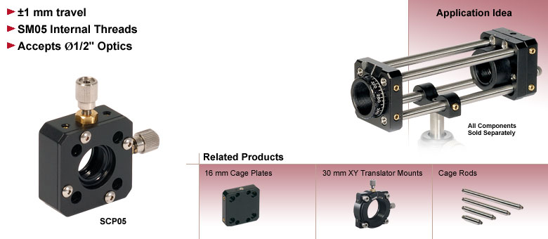 SCP05XY转接镜头座的螺纹密度为每英寸100线,每转可实现0.25毫米的位移,且无刻度标记。该转接座在垂直于笼式系统光轴的方向上提供±1毫米的行程。可移动滑块采用我们SM05(0.535英寸-40)系列螺纹,可直接安装Ø1/2英寸光学元件。