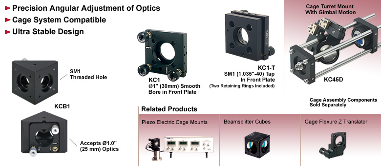 笼式组件系统提供了一种便捷的方式,用于构建大型光机械系统。该系统采用一系列经过精密加工的标准化组件,旨在实现高度灵活性和精准对准。我们KC系列安装座专为在笼式系统中实现光学元件的精确角度定位而设计。