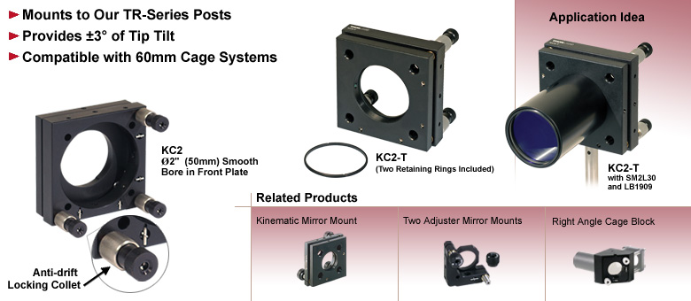 KC2-T 运动学镜架提供类似的功能,内置一个SM2内螺纹板。该镜架随附两个SM2RR固定环。