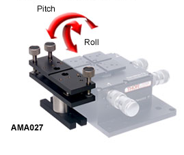 AMA027旨在将一个倾斜的光学元件安装在我们三轴柔性平台之一的前方。该附加平台通过照片中所示的两个带标签的拇指螺钉提供俯仰和滚转调节功能。滚转和俯仰调节的范围均为-8º至+4°;同时使用三个调节器,可实现对整个平台高度的调整。在整个组件的标称高度62.5毫米附近,高度调节量可在-1毫米至+4毫米之间变化。