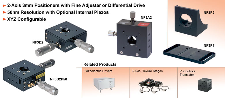双轴:微调螺钉或差动驱动加压电选件 NanoFlex™ 双轴柔性平台可在两个正交轴向上实现3毫米的精细位置调节,其柔性设计非常适合用于构建无粘滞效应的光机电组件。中央通光孔采用0.8英寸-36 TPI螺纹。RMS。顶部移动平台和固定底面均支持通过RMS螺纹使用标准显微镜物镜。