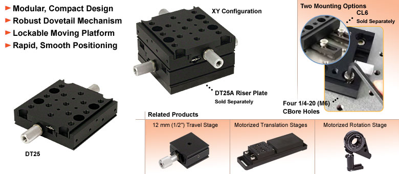 DT25燕尾槽平移台是一款面向通用定位应用的入门级定位器。它提供25毫米(1.0英寸)的行程范围,每旋转调节器一圈可实现1毫米(0.04英寸)的行程。该设计采用精密滚制的M6×1.0毫米螺距丝杠,可在整个行程范围内实现平稳的直线定位。移动平台可锁定,以防意外移动。