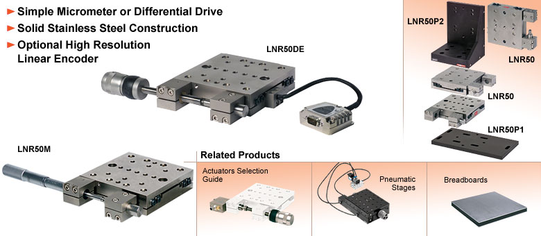 当稳定性、长行程和高承载能力都是重要参数时,TravelMax™系列舞台提供了理想的解决方案。该系列采用目前市面上品质最高的直线导轨设计,并通过使用热匹配材料进一步提升性能,即使在非理想条件下也能确保稳定运行。全不锈钢结构的刚性,以及重型交叉滚子轴承,可在整个50毫米运动范围内提供均匀的性能。根据应用需求,可选择两种驱动方式。随LNR50M提供的可锁定标准测微计具有2英寸量程,螺纹间距为0.1毫米。游标每10微米设有一个刻度。LNR50D配备了专利的差动驱动装置。粗调每转可实现0.5毫米的移动,而精调每转则可实现25微米的移动。