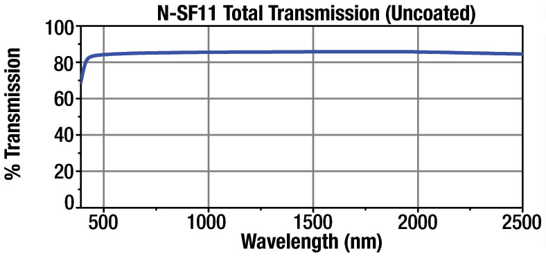 N-SF11玻璃是SF11的RoHS合规版本,最常用于恶劣环境,因为它对生物降解呈惰性,且能抵抗自然环境中常见的化学物质、碱和酸。N-SF11未镀膜的波长范围为420纳米至2.3微米,其使用范围相比我们符合RoHS标准的BK7玻璃——N-BK7玻璃——略微向红端偏移。N-BK7玻璃的未镀膜波长范围为350纳米至2.0微米。