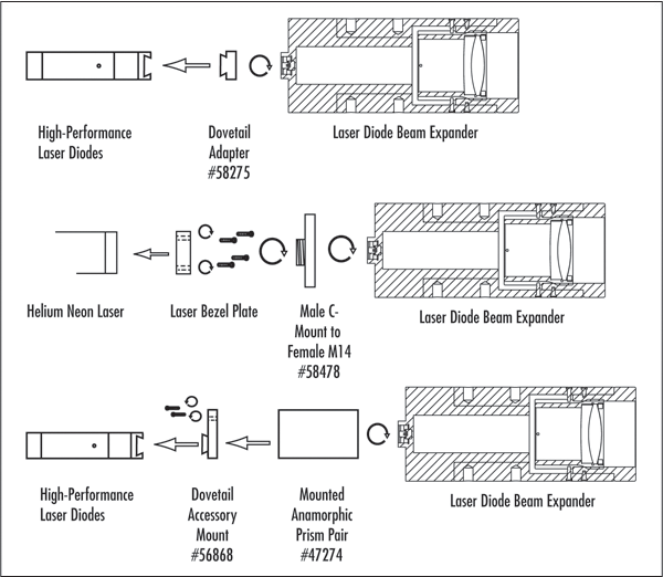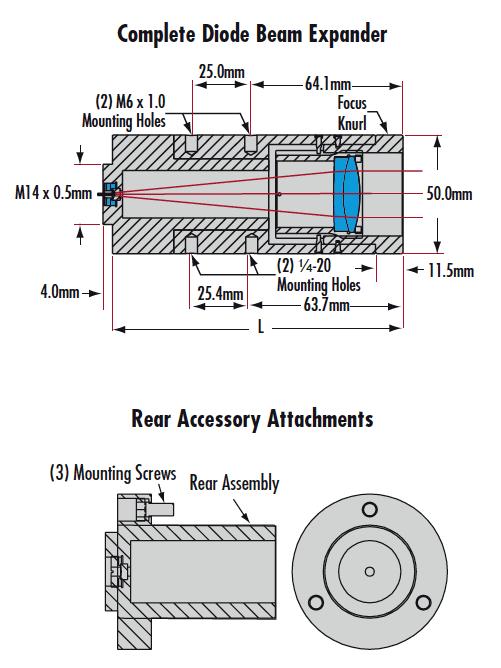 后部附件是一种轻松且经济高效的方式,可用来更换光束扩展器的放大倍率。只需拆下光束扩展器的后部组件(拧下三颗内六角螺钉),然后换上以下所列的所需放大倍率附件即可。例如,4倍扩束器(#58-271)可通过使用6倍后部附件(#58-274)替换原先配备的4倍附件,改装成6倍扩束器。