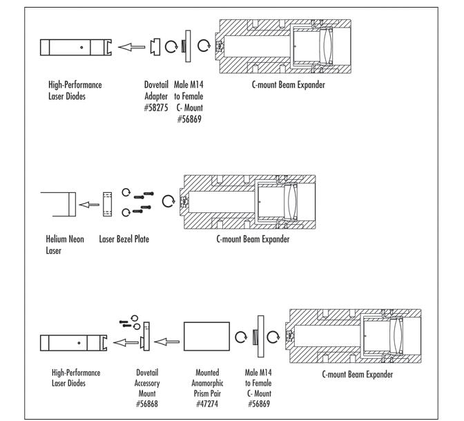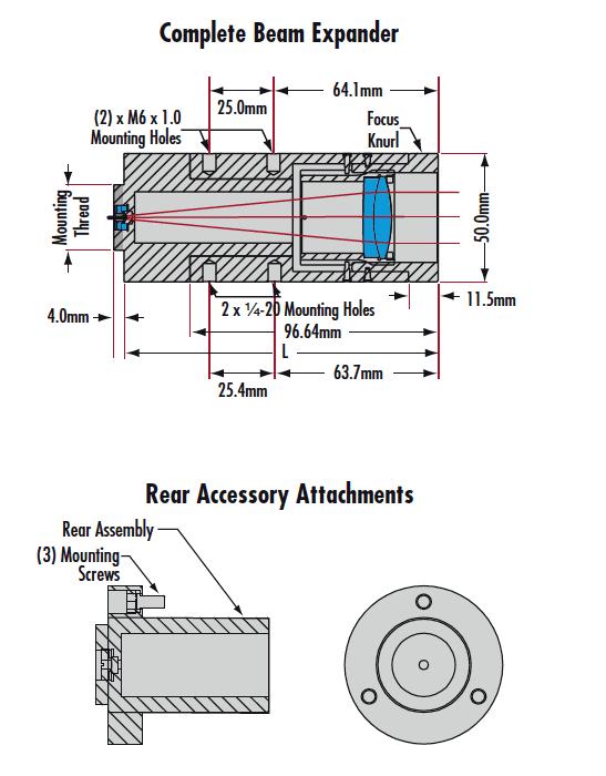 后部附件是一种轻松且经济高效的方式,可用来更换光束扩展器的放大倍率。只需拆下光束扩展器的后部组件(拧下三颗内六角螺钉),然后换上以下所列的所需放大倍率附件即可。例如,20倍扩束器(型号#55-579)可通过将原配的20倍附件替换为5倍后置附件(型号#55-580)而变为5倍扩束器。请注意:后置配件附件不可串联使用以提高放大倍率。设计中还包括以下其他功能:对焦锁定固定螺钉、C接口(1英寸-32 TPI),用于安装到我们的氦氖激光器上,以及镀有1/4波长氟化镁的光学元件(@ 632.8纳米,具有抗反射涂层)。