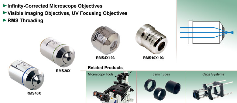 RMS系列显微镜物镜适用于传统显微镜观察、共聚焦成像以及光纤耦合等应用。Thorlabs还销售LSM系列扫描镜头,对于某些需要远心镜头的成像应用而言,它们可能是更佳选择——这类镜头可在激光扫描通过入射光阑时,保持较小的焦斑并维持恒定的光程长度。
